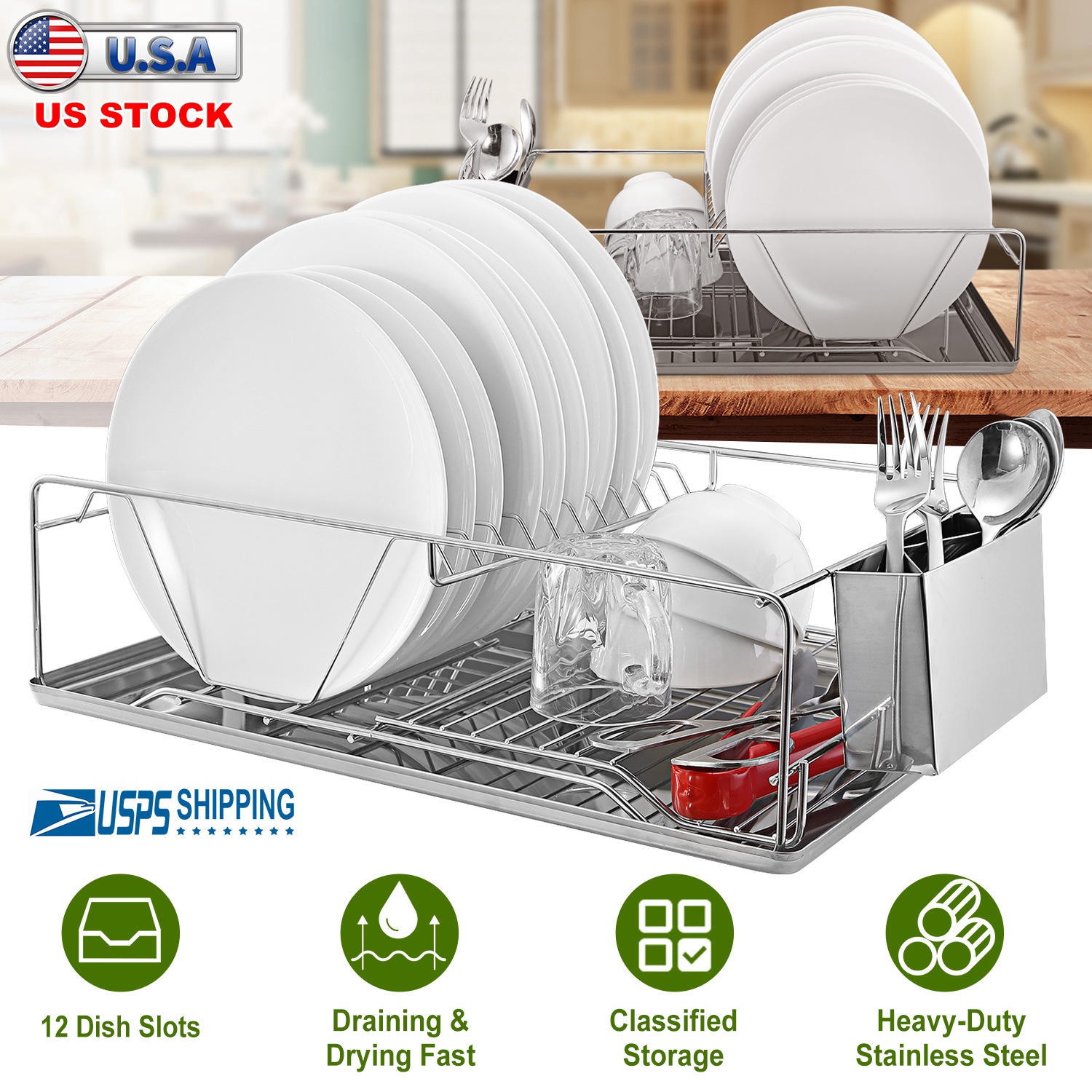 Dish Drying Rack Stainless Steel Dish Rack w/ Drainboard Cutlery Holder Kitchen Dish Organizer