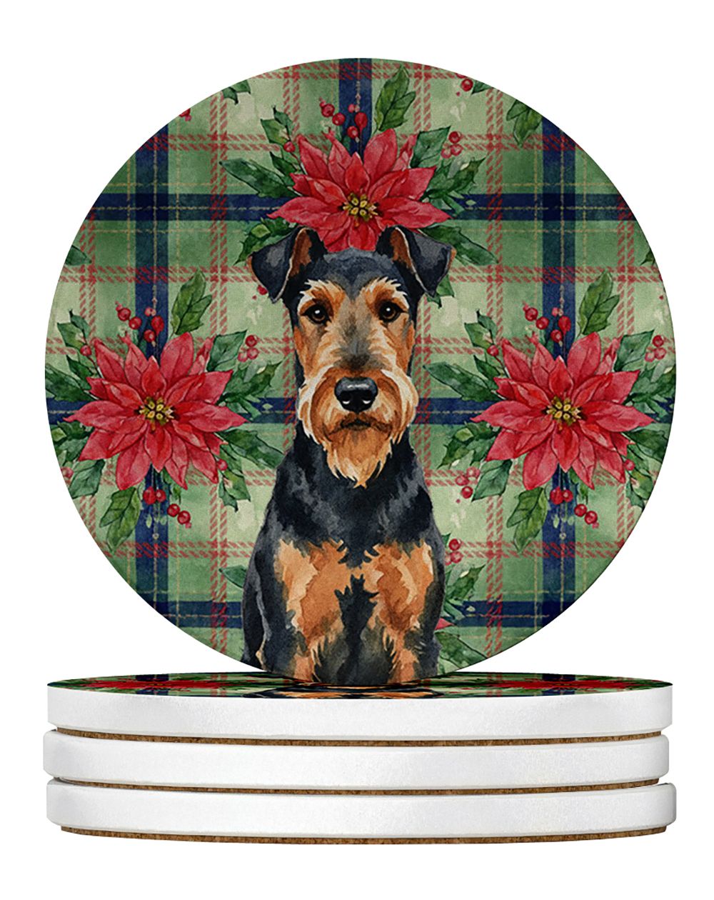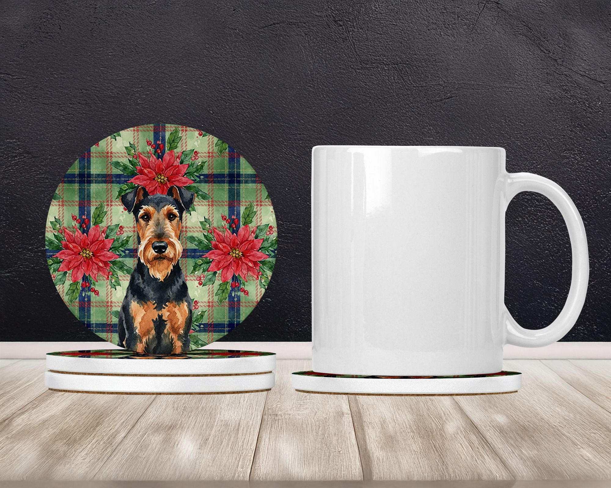 Airedale Terrier Christmas PoinsettIas Large Sandstone Coasters Pack of 4 Absorbent Round Coasters Decor Gifts for Men or Women, 4 in, Multicolor