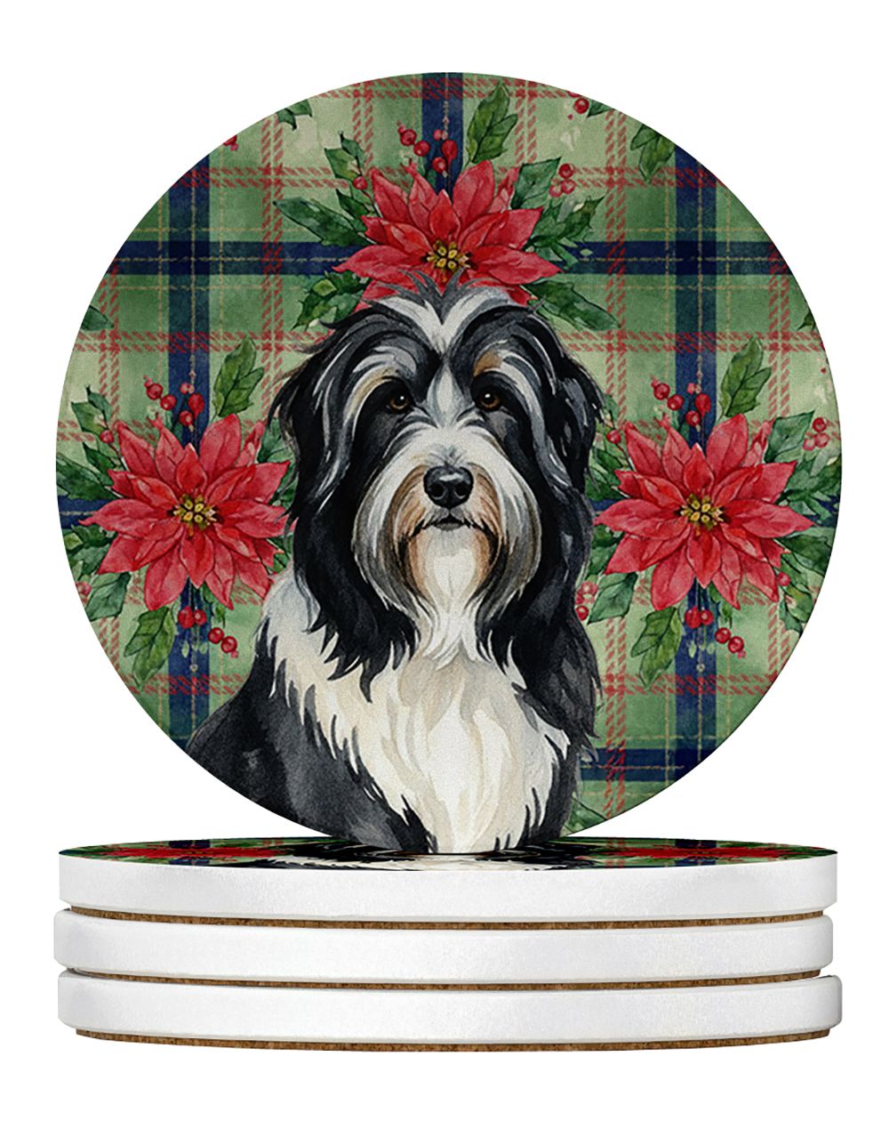Large Sandstone Coasters Pack of 4 featuring breed specific Bearded Collie artwork. Celebrate Christmas with this Christmas Sandstone Coasters Pack of 4. Introducing Caroline's Treasures Large Sandstone Coasters Pack of 4, the perfect addition to your home decor. Each coaster measures nearly 4 inches and is made from absorbent sandstone with a cork backing. Designed and printed in the United States, these coasters feature artwork from Caroline's Treasures' talented artists. Protect your countertops and tables from hot and cold drink condensation with these absorbent coasters. They efficiently absorb moisture, ensuring your surfaces stay dry and clean. Choose from a wide range of designs to update and enhance your decor or give them as a thoughtful gift for any occasion. Cleaning is a breeze—simply wipe the coaster with a damp towel to remove any spills or stains. Each set comes in a brown gift box, making it ready to be wrapped for that special person in your life. These absorbent sandstone coasters also make an excellent housewarming gift, providing both practicality and style. Celebrate birthdays, Mother's Day, Father's Day, Thanksgiving, Christmas, Teacher's Appreciation Day, or simply show someone you care with these versatile and charming coasters. Caroline's Treasures Large Sandstone Coasters Pack of 4 is the perfect happy gift for any occasion.